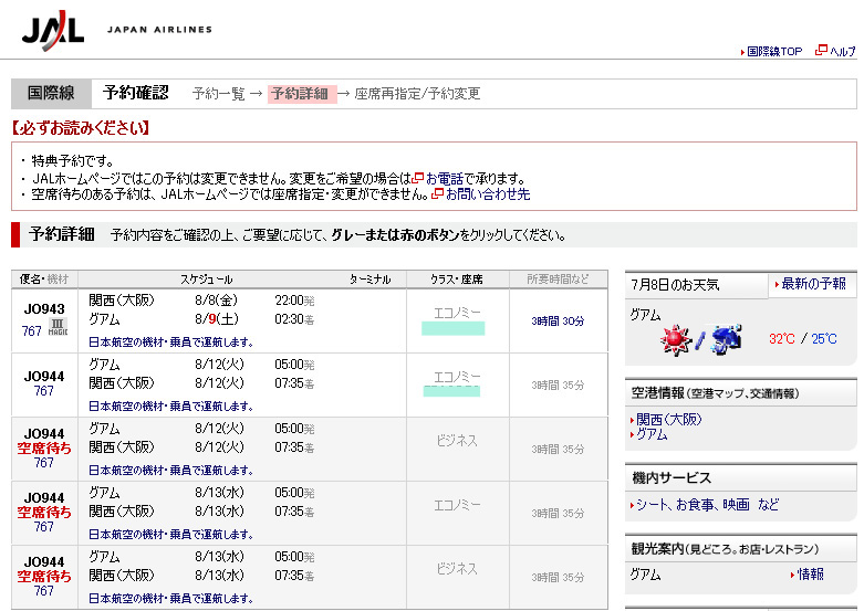 インターネット上では、複数のキャンセル待ちができませんが、電話であれば複数のキャンセル待ちが可能です。しかし、インターネット上だけで予約ょすると、グアムだと1人19,500マイルと通常より500マイル割引きがあるのですが、電話予約だと通常の1人20,000マイルになってしまいます。
